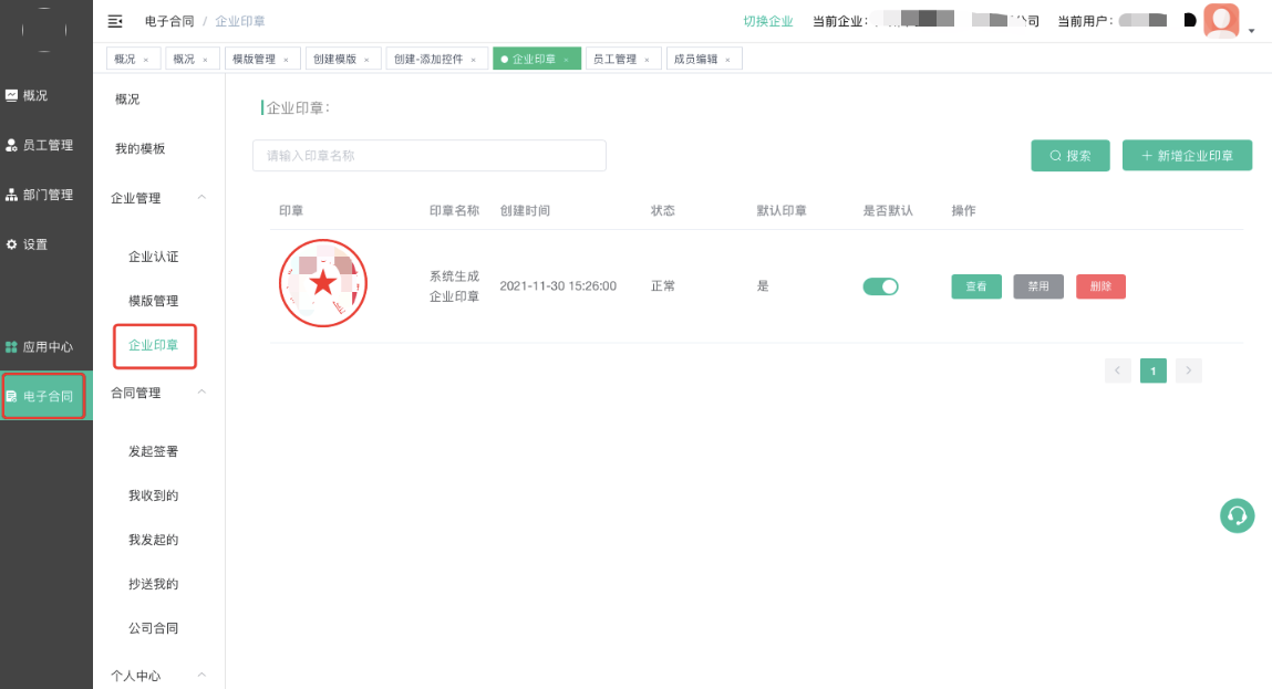 企业认证成功则会自动创建企业印章,只显示当前企业印章,其他企业印章需要切换到相关企业查看管理。