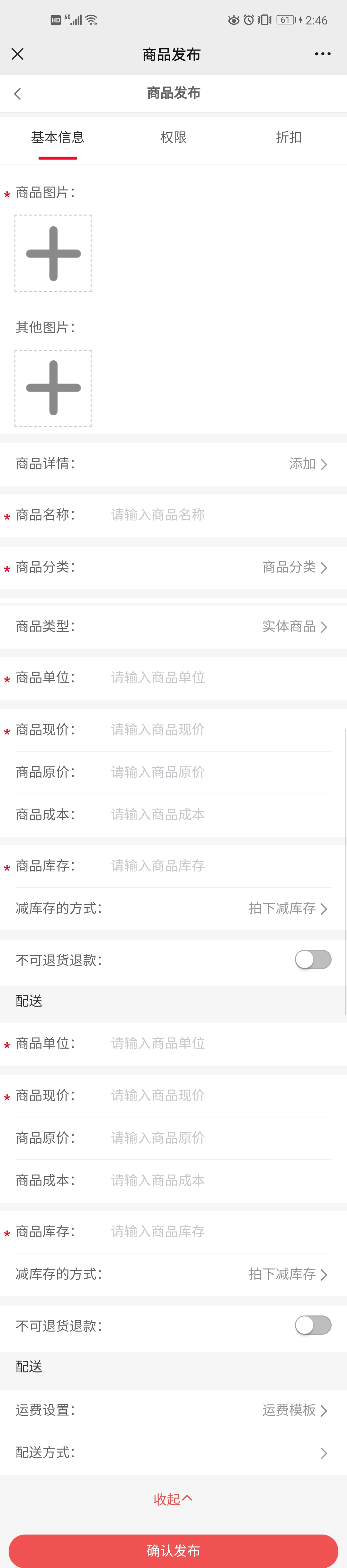 (5-1)基本信息:商品图片、其他图片、商品详情、商品名称、商品分类、商品类型、商品单位、商品现价、商品原价、商品成本、商品库存、减库存的方式、是否可退货退款、运费设置、配送方式